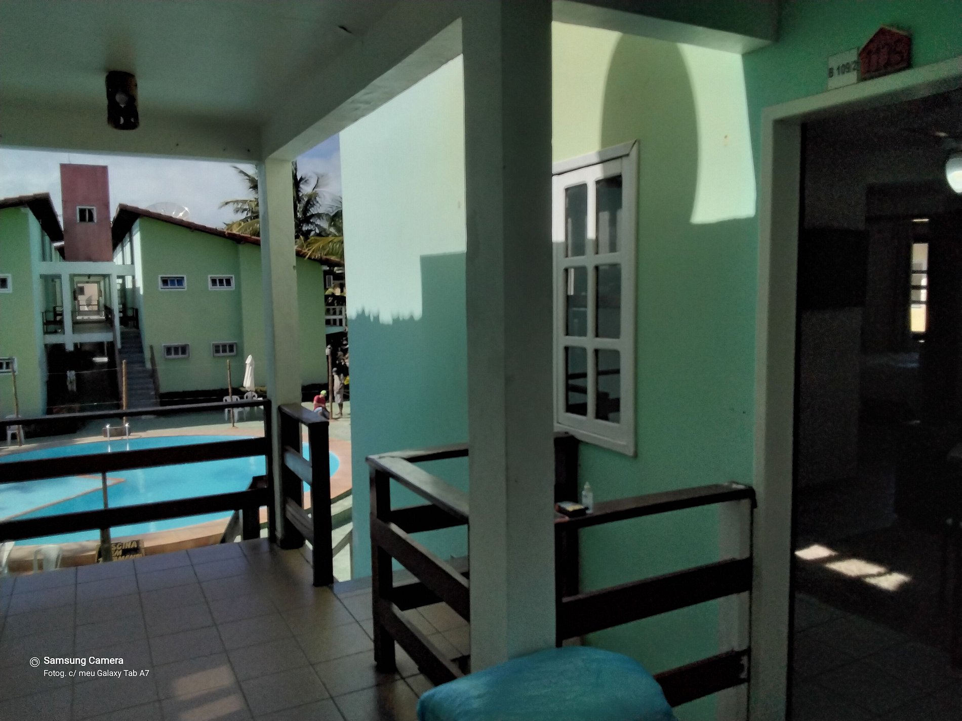 O apartamento fica no andar superior ao lado da piscina