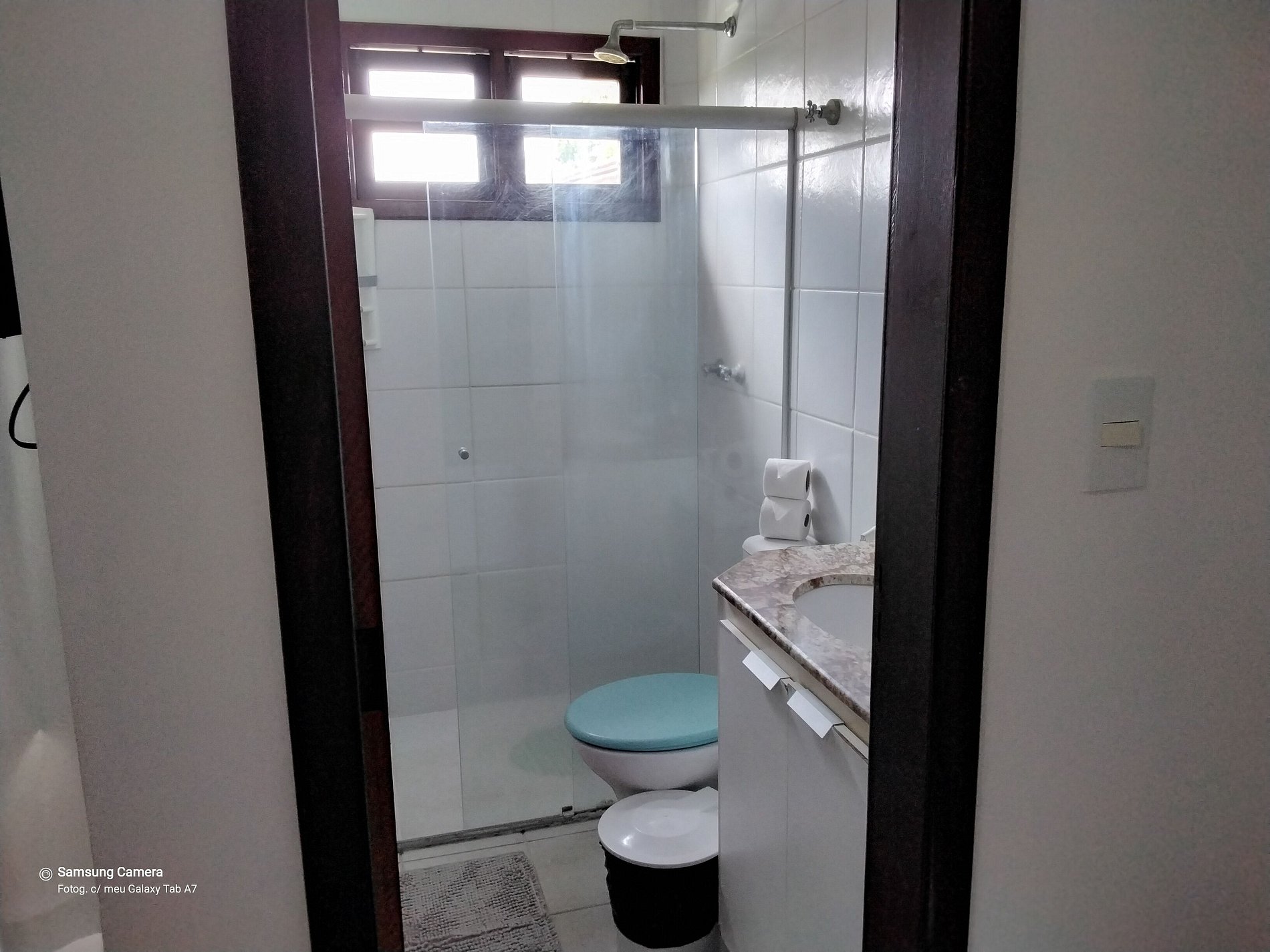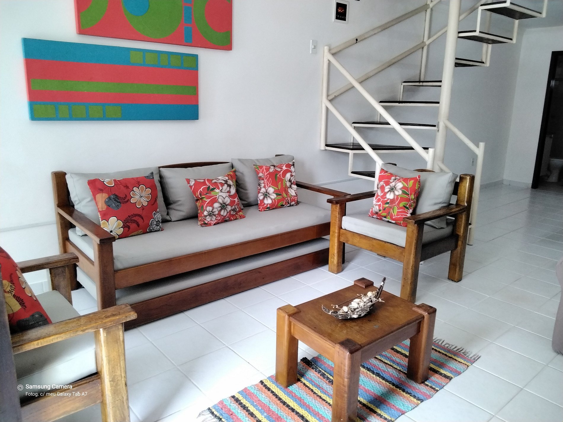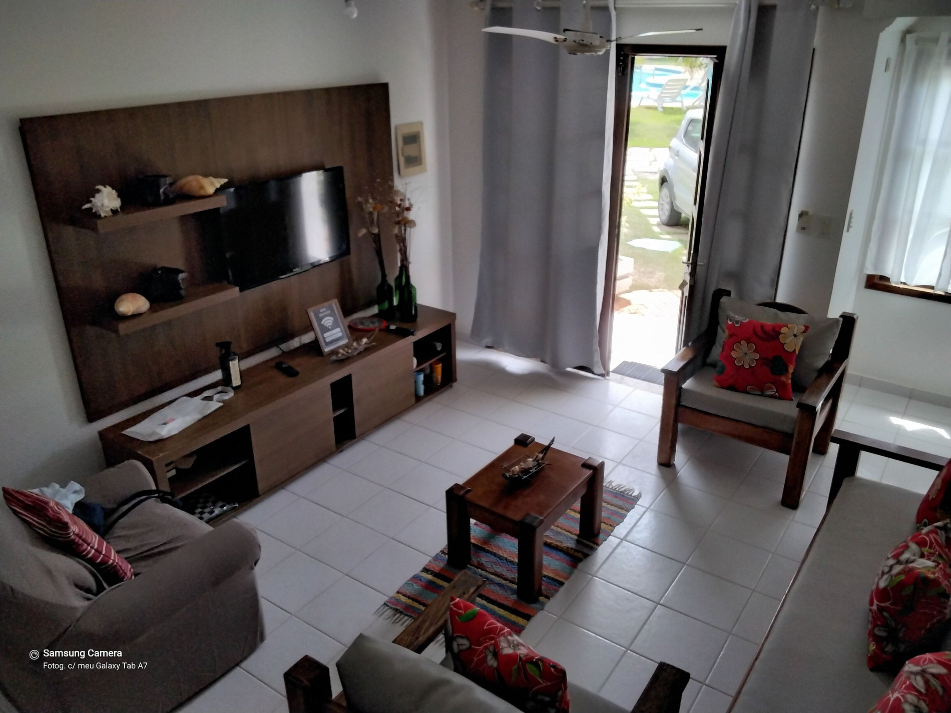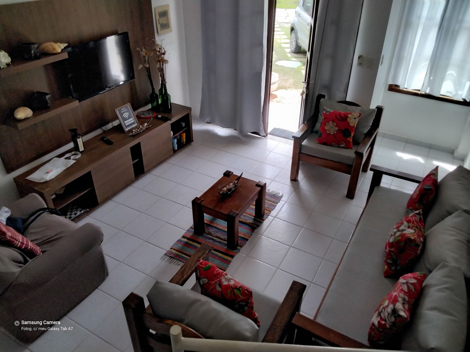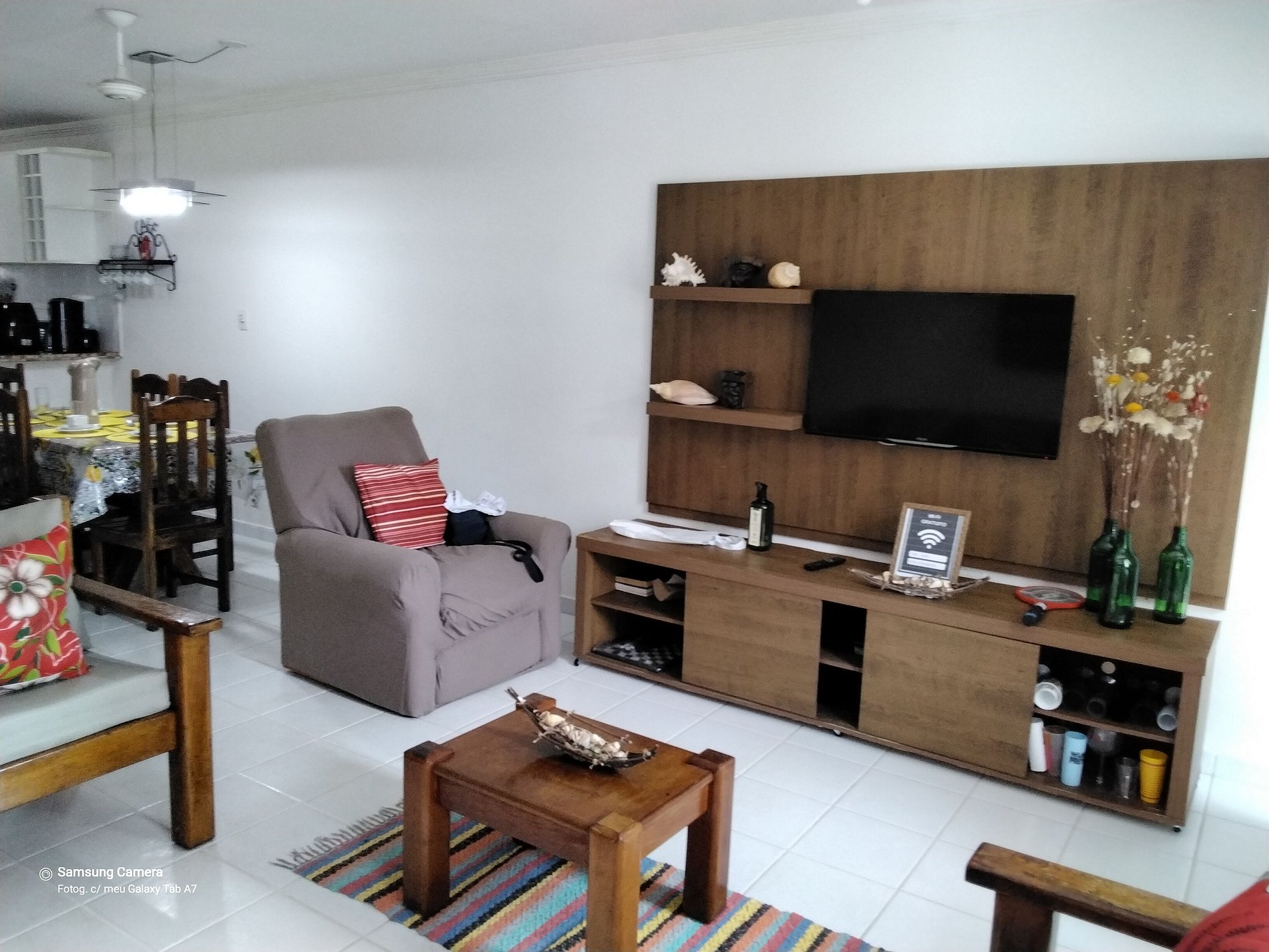 A casa é duplex, onde no andar térreo temos : cozinha completa, banheiro, sala de estar com TV, sala de jantar e área privativa.